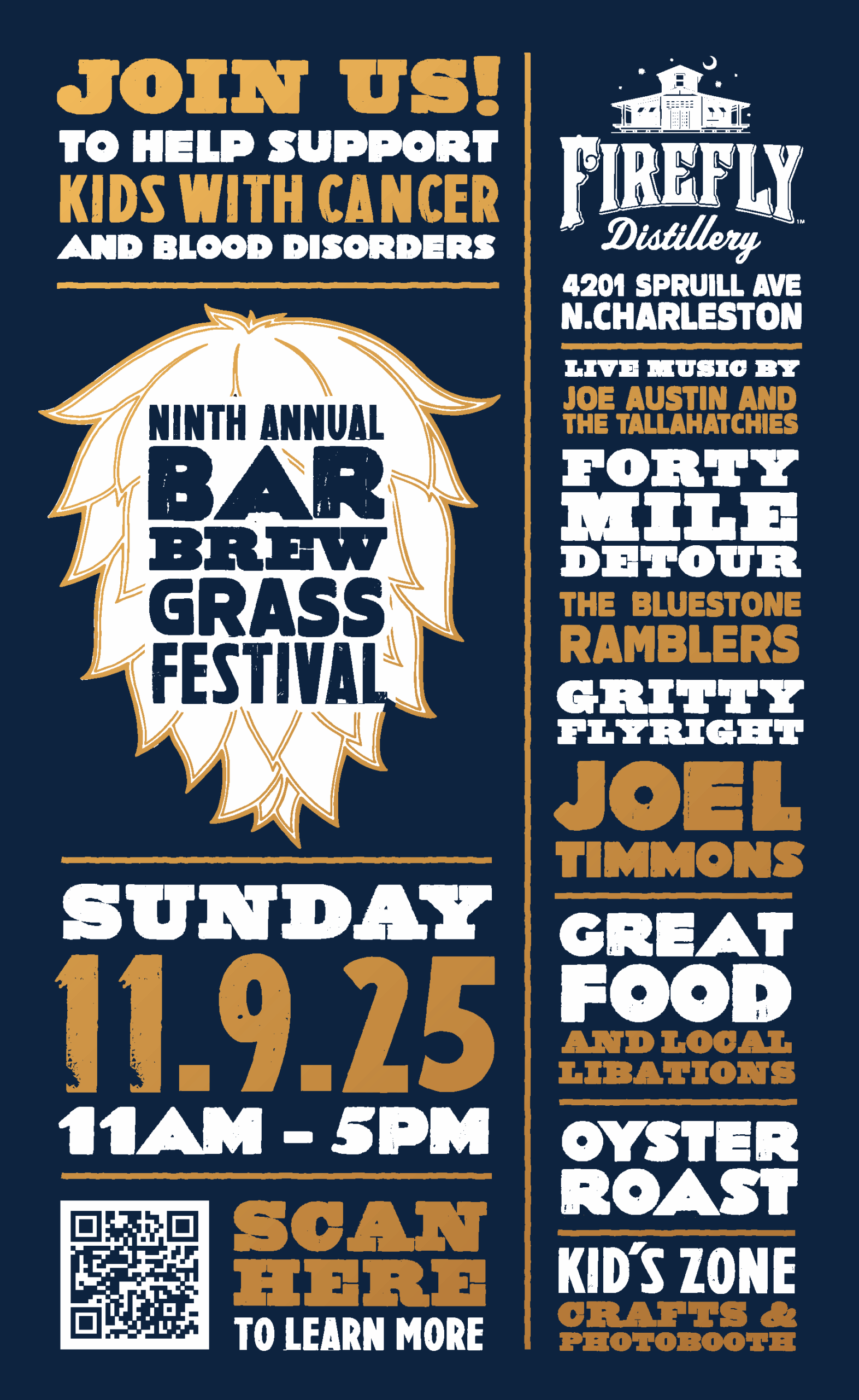 Support kids with cancer and blood disorders – be a part of the 9th annual BarBrewGrass Festival at Firefly Distillery in North Charleston on Sunday, Nov. 9.