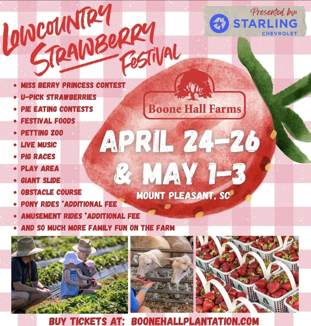 Boone Hall is hosting the 2026 Lowcountry Strawberry Festival from April 24th through the 26th, and May 1st through the 3rd. See what's in store and how you can get tickets for this event! Photo: 101.7 Chuck FM